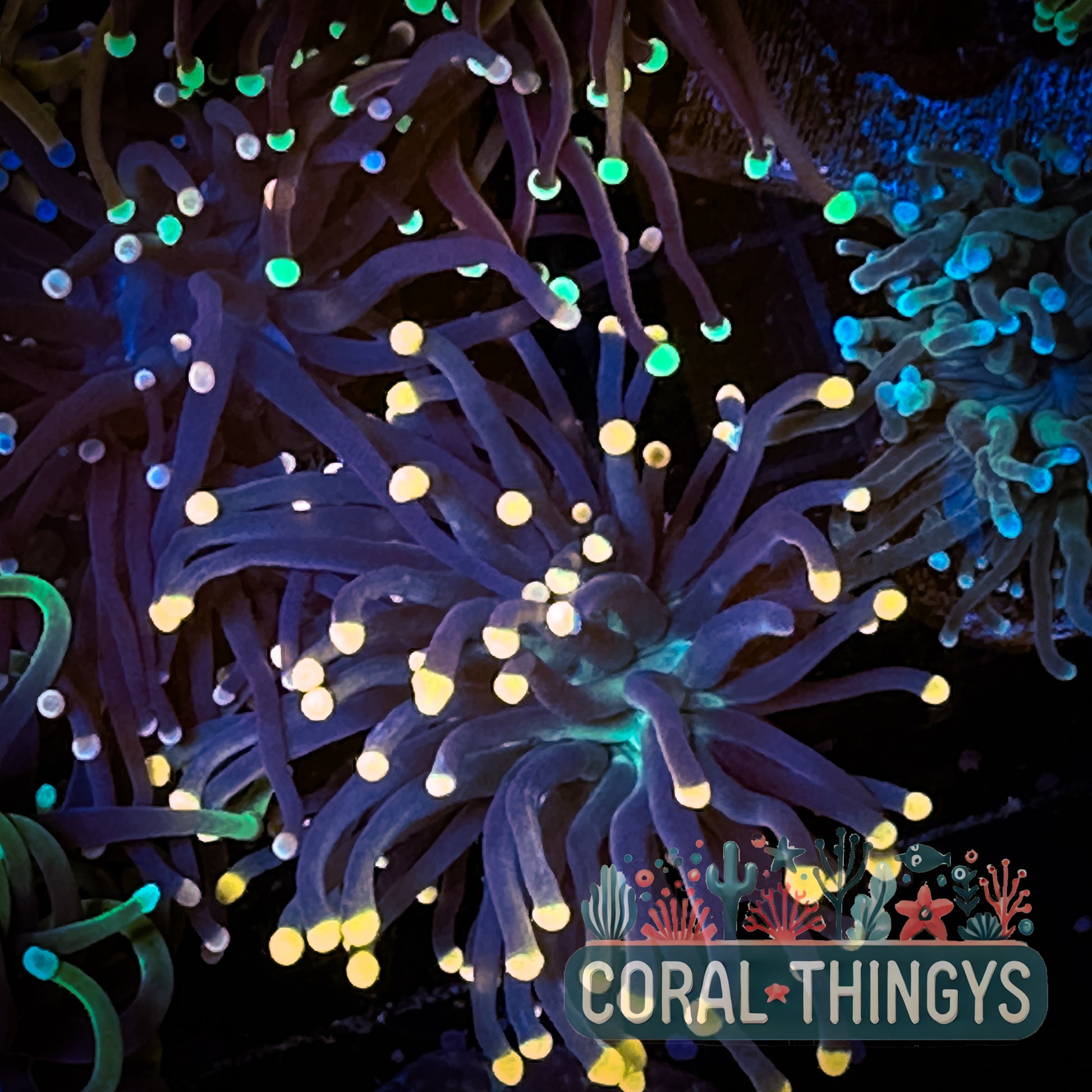 Rare Sun Devil Torch radiates brilliant golden yellow coloration with fiery bright tips that create a blazing sun-like appearance in your reef aquarium. This stunning LPS coral features long flowing tentacles with exceptional color contrast and dramatic feeding response that adds both warmth and movement to any marine aquarium setup. The intense golden hues and devil-inspired name make this premium hard coral a captivating focal point for torch coral enthusiasts seeking bold, high-impact additions to their reef collection.